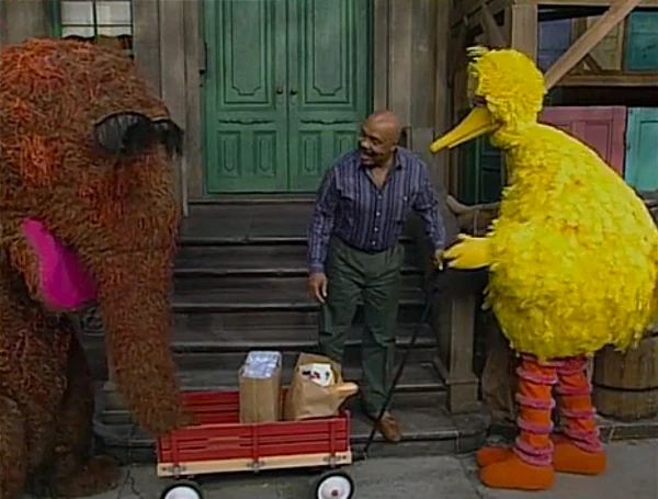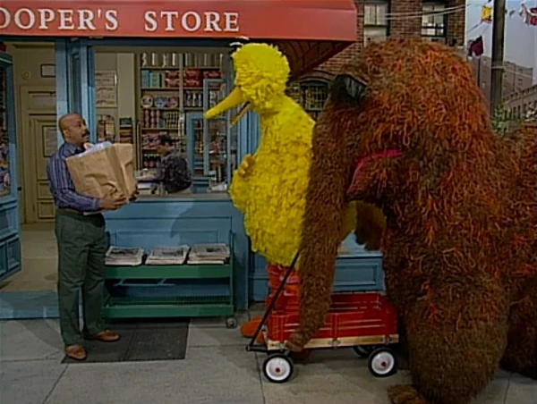 SCENE 4 | Big Bird and Snuffy return to "the station" (Hooper's) and drop off the kids. Alan has finished packing some groceries and hands them to Gordon, noting they are kind of heavy. Big Bird and Snuffy offer to transport them on their train, insisting it'll be more fun that way. Gordon agrees to play along and loads the groceries in the wagon. Big Bird tells him to wait at the other train station, meaning 123 Sesame Street. When Gordon sits on the steps, though, the two begin traveling in the opposite direction. Big Bird explains that their train tracks head the other way and they must follow them, so Gordon continues to wait while the train departs, hoping they'll arrive soon. |