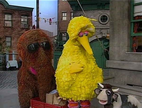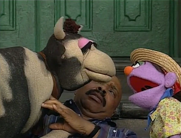 SCENE 6 | The wheel is fixed, so the train can resume its route. Big Bird and Snuffy start to approach the steps when a cow (Alice Dinnean) unexpectedly blocks their path in front of the building. Gordon suggests going around it, but Big Bird reminds him how they can't go off their tracks. Snuffy suggests doing something fast as he's allergic to cow hair. Big Bird tries asking the cow to move, but when that doesn't work Snuffy delivers a strong sneeze, blowing the cow away from the tracks and on top of Gordon! The cow's owner (Stephanie D'Abruzzo) shows up looking for her bovine Mary Elizabeth, telling her she can play with her "little friends" later before they go. |