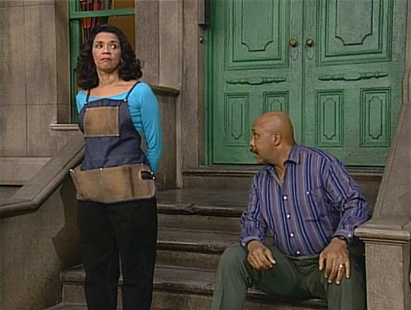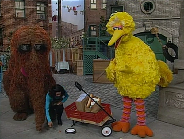 SCENE 5 | Maria becomes confused when Gordon tells her he's waiting for his groceries to arrive by train. She finds out what he means as Big Bird and Snuffy finally make their way back when suddenly, before they can reach the station, one of the wagon's wheels breaks off! Thinking they're stuck and can't continue, Big Bird questions what to do. Gordon tries to get his groceries himself but Snuffy and Big Bird keep him away, since they haven't reached the station yet. Fortunately, Maria has a set of handy pliers with her and goes to fix the wheel. "Thank goodness there was a train mechanic in the neighborhood," Gordon comments. |