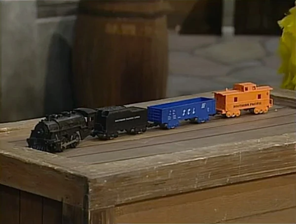 SCENE 1 | Big Bird and Snuffy are going to pretend to be a train, just like the model one they have. Big Bird takes up position in the front as the engine while Snuffy acts as the caboose, but when they start to travel, Big Bird wants to make a "chugga-chugga" sound while Snuffy prefers they make a "choo-choo" sound. The two fight over what sound to use, trading "chugga-chuggas" and "choo-choos" back and forth and realize they can put the two sounds together and make it a "chugga-chugga choo-choo" - a much better sound for a train. They put it to use as they travel around the yard. |