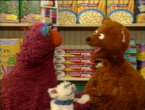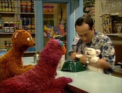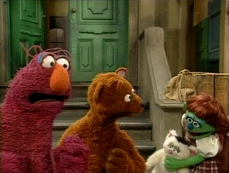 SCENE 5 | Telly and Baby Bear come up with a name for their kitten: Little Murray! They talk about what they'll have to do to take care of Little Murray, including feeding him and making sure he gets exercise. They take Little Murray over to Hooper's Store for something to eat. |