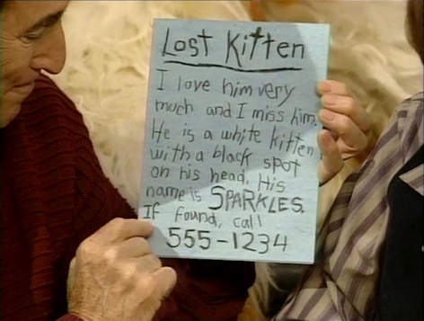 SCENE 7 | Elizabeth finishes making the sign and shows it to Bob and Linda. They agree that she did a good job, giving Sparkles' name, description, and a phone number to call. Elizabeth goes to look for a good place to put her sign up. |