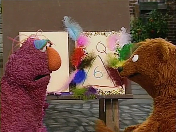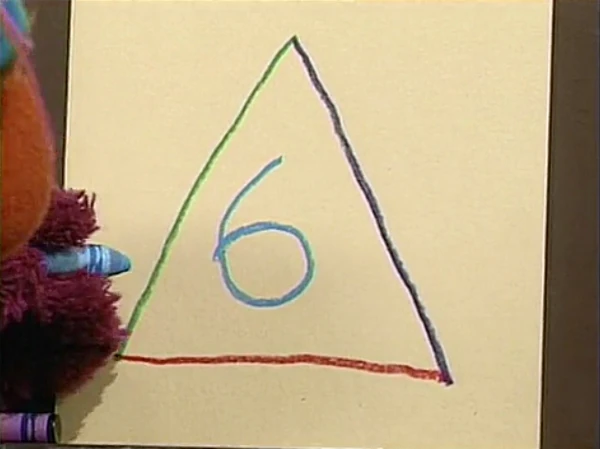 SCENE 3 | Following Baby Bear's instructions, Telly makes a new, bigger triangle where each side is a different color. Baby Bear also recommends they add a number to the piece to make it more unique, so Telly adds a number 6. He tells Baby Bear he still likes his first drawing, but Baby Bear goes to get more supplies to enhance the second one. |