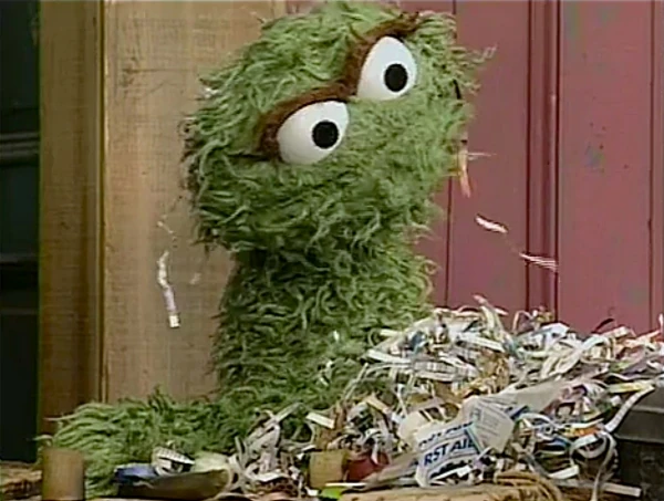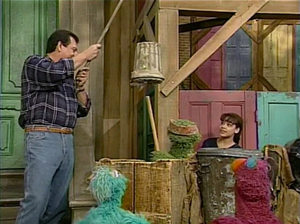 SCENE 6 | Luis, Gabi, and Rosita let Oscar play a game: he tries to crack open a trash can-shaped piñata. He succeeds, and is buried by a pile of small junk pieces, torn newspaper, and fish bones. As much as he enjoys it, Oscar still thinks that at least one person will do something sweet and nice for him, while Telly gives a suspicious-sounding chuckle. |