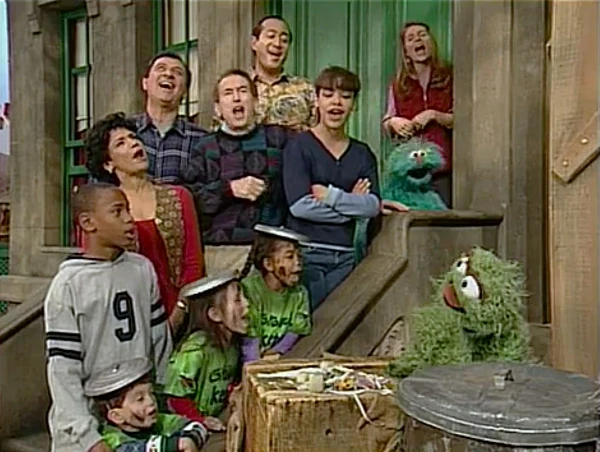 SCENE 7 | Oscar finds everyone (now joined by Bob, Miles, and the Grouchketeers) on the steps of 123 Sesame Street, and thinks that they're going to sing "Happy Birthday to You." Instead, they shout "Grouchy Birthday to You!" Oscar is almost brought to tears and admits that he was wrong; everyone knew how to celebrate a Grouch's birthday properly. Telly then arrives to give him his present: hugs and kisses! He yells for everybody to get away from his trash can, telling the viewer in private, "You know, they're not half bad... for nice people!" |