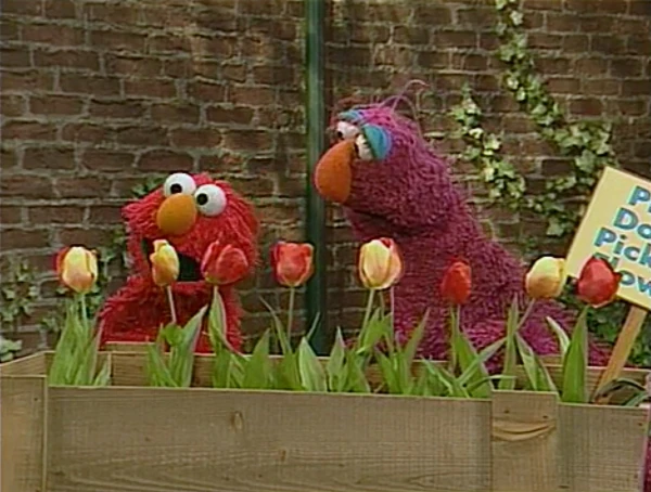 SCENE 1 | Elmo and Telly admire the flowers in the garden and want to pick some. Luis points out the sign - "Please Do Not Pick the Flowers," and explains that if they or anyone else were to pick them, there wouldn't be any more for others to enjoy. The monsters realize they should leave the flowers where they are and invite Luis to smell them. |
