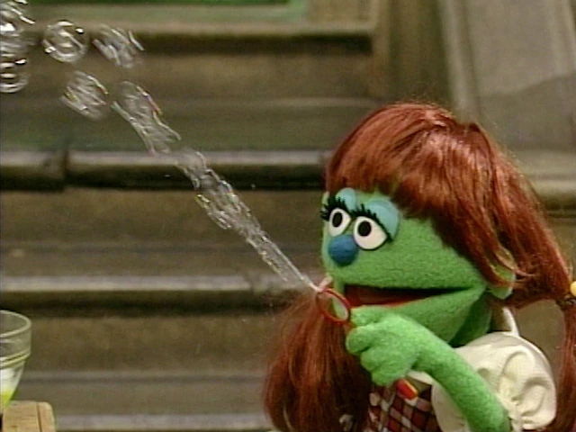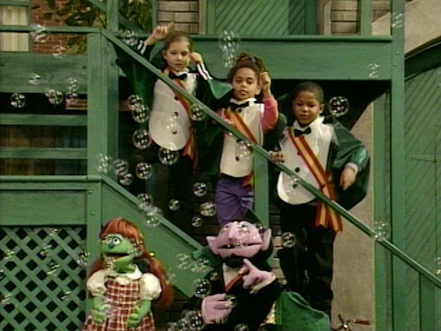 SCENE 4 | Elizabeth admits to Big Bird that she's starting to get exhausted from bubble-making, but even though her arm is tired she still doesn't want to stop with the bubbles. When Big Bird leaves, she wishes she could have bubbles around her all the time without having to blow them. Suddenly, her Fairy Bubbleperson pops into view and offers to grant her wish. With his tongue-twisting spell, her wish is granted and bubbles begin to spontaneously float around her! |
