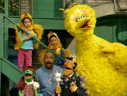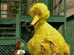SCENE 6 | The Count and the Countketeers are still counting bubbles, following them as they float away near the park. Big Bird and the Birdketeers come back to Elizabeth and learn about her granted wish. They want to sing "The Alphabet Song" with her and she offers to have them do it with bubbles ("It's an all-new alphabet frontier!"). After doing what she calls the "alpha-bubble-et," Elizabeth then runs off to fetch her favorite book and Big Bird and the Birdketeers look for other bubbles on Sesame Street, segueing to... |