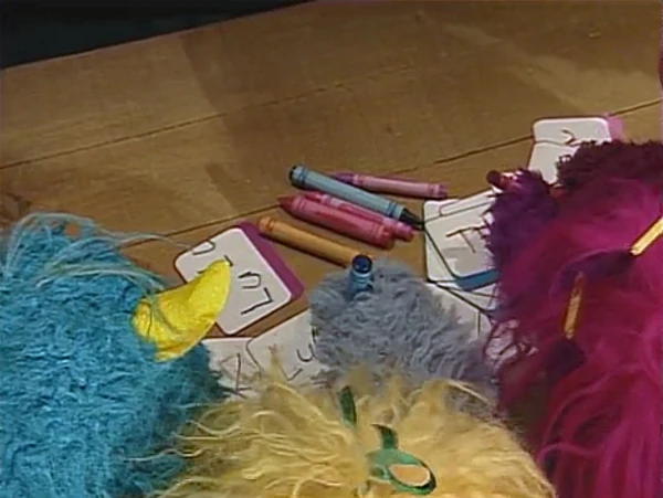 Lulu decides to give it a try and everyone goes over to a small writing table to make their name tags using crayons, as the music from the "Write Your Name" song plays. After a bit of practice, the monsters show off how well they've written their names. Lulu especially feels so proud of writing her name that she wants to do it again ("Fun this big doesn't happen every day, you know!"), and the group starts working on more name tags. |