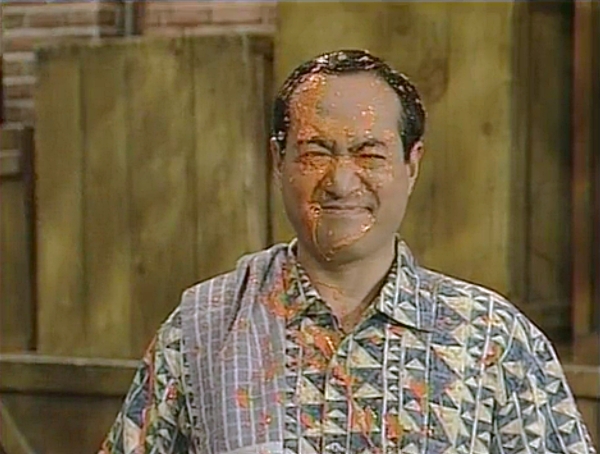 SCENE 3 | Everybody is having a snack when Alan notices Snuffy isn't eating his spaghetti with carrot sauce. Snuffy says that he tends to slurp when eating spaghetti, which could result in getting orange spots on his costume. Alan has an idea - he uses a spare tablecloth to cover up Snuffy's cloud costume! Now Snuffy can slurp away... though it results in Alan getting splattered in the face with carrot sauce. |