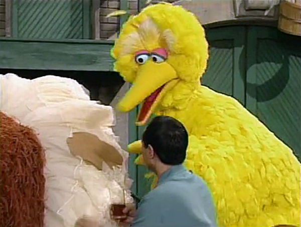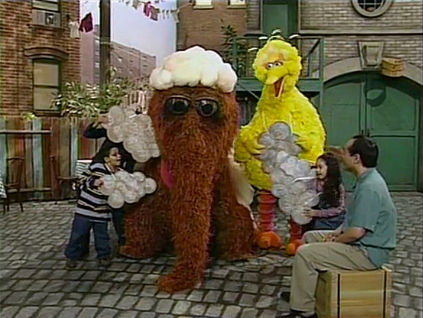 SCENE 6 | Big Bird invites Alan to be the audience for their song, warning him to keep his glass of iced tea away from Snuffy lest it getting spilled. Snuffy and the group perform the cloud song and it goes off without a hitch. Snuffy then talks about how he avoided getting dirty and demonstrates his "all jump up" from his game earlier, which shakes the ground and causes Alan's tea to fly out and hit his costume! Snuffy starts to panic as everyone rushes off to get some things to clean up the stain. |