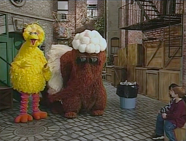 SCENE 2 | Big Bird helps make sure Snuffy's cloud costume is still clean, gently brushing it and cautioning him about a nearby trash can. Snuffy decides to sing the song he will perform in Snufflegarden as he does a soft shoe dance in the yard, imagining himself as an actual cloud floating in the sky. He feels a bit tired afterward and wants to sit down, but the others warn him it might ruin his costume. "It's not that easy staying clean," admits Big Bird. |