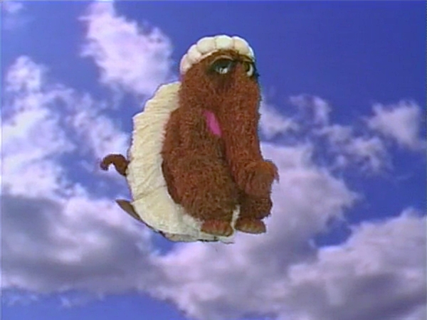 SCENE 1 | Big Bird plays hopscotch with Jelani, Andrew, and Chad when Snuffy bumps into them, wearing a puffy white costume and saying "float... float..." to himself. He explains that he is pretending to be a cloud, and is rehearsing his part for a Snufflegarden play about the sky. Big Bird wonders if he can play with them while wearing his costume and Snuffy decides to ask his mother, who is busy ordering large quantities of food from Alan at Hooper's Store. Mrs. Snuffleupagus says it's fine for Snuffy to play as long as he can keep his costume clean, and she will pick him up to go to Snufflegarden later. In the meantime, Snuffy and friends all pretend to be clouds. |