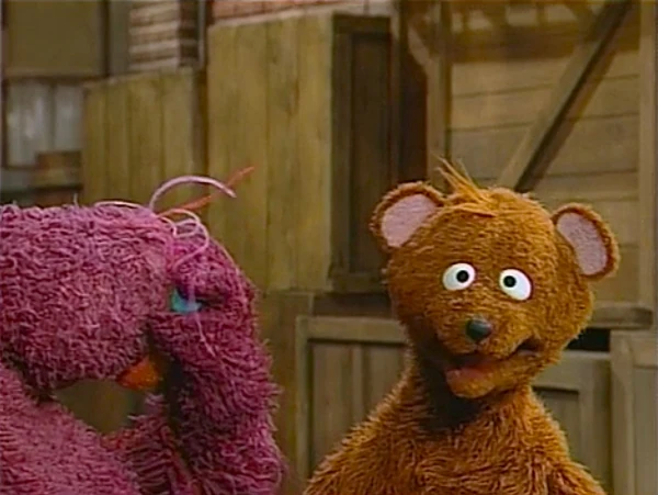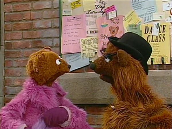 SCENE 5 | Baby Bear shows up wearing his Mama Bear's fuzzy purple coat, a frizzy wig, mittens, and a fake nose, thinking the monsters will let him participate in the sing-a-long if they think he's a monster. Papa Bear notices this (exclaiming "Okefenokee!") and gives his son a moving speech: "You shouldn't have to pretend to be something you're not just to be included. You're a bear, and you should be proud to be a bear, no matter what. So, if someone doesn't want to play with you because you're a bear, well, that's their bad luck, because you are one fine bear to play with!" Baby Bear agrees with this and decides that it's better to be himself. |
