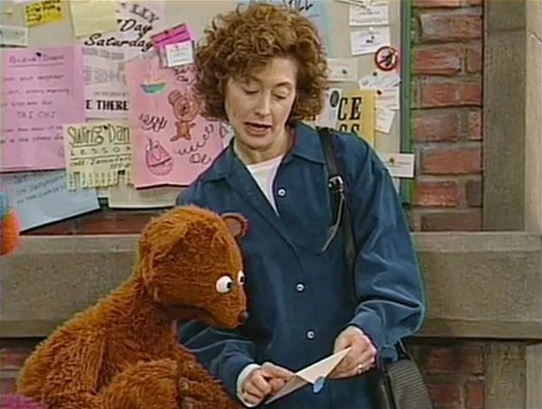 SCENE 6 | Telly and the day care group of monsters rush up on Baby Bear, chanting "Bear! Bear! Bear!" Telly reports that Baby Bear was invited to the sing-a-long after all, though they don't know why he never got an invitation in the mail. A woman named Bebe Berra (Fran Brill in an on-screen cameo) shows up to give him the invitation that was supposed to be delivered to his mailbox, but somehow ended up in hers. The happy monsters and bear head off to the sing-a-long, while Bebe wonders where to find some cheap drapes. |
