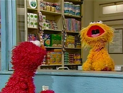 SCENE 1 | Elmo and Zoe notice Gordon enjoying an ice cream cone. He gives the monsters some money to get some ice cream at Hooper's Store, and before leaving, Elmo says, "Last one there is a rotten egg!" Zoe has never heard of this phrase and worries she'll become an actual egg when Elmo and Gordon explain it's just a silly expression. Zoe gets to Hooper's first and enjoys the game so much, she does another "rotten egg" race inside the store, gleefully chanting, "Elmo's a rotten egg! Elmo's a rotten egg!" |
