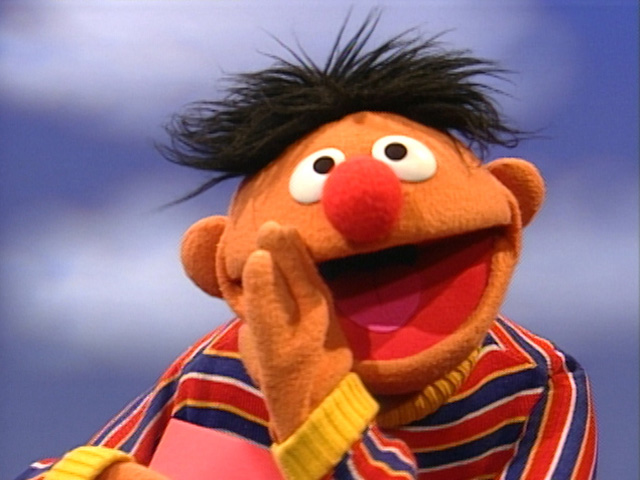 Muppets | Ernie and Rubber Duckie laugh out loud, thinking the previous segment was funny. (First: Episode 3808) |