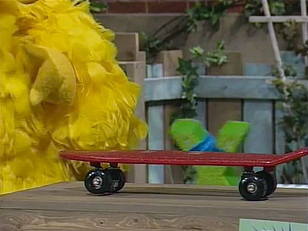 SCENE 3 | Big Bird begins training the tiny X. First, he must get on the skateboard, but the X becomes scared and claims he may fall off and get hurt. Big Bird reminds him he has helmets (one for each top line) and kneepads on, plus heβs there to help. Big Bird places the X on the skateboard, and soon the X becomes dizzy and nauseous and wants to come down. |