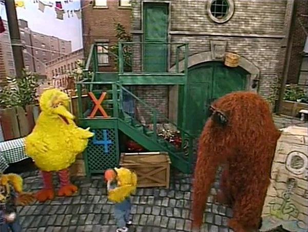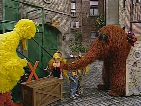 SCENE 6 | Elmo and Snuffy are ready to give up on finding an X by now when they spot Big Bird holding a Birdketeer meeting in the yard... and displaying a letter X on top of a crate! The Birdketeers look inside the crate to see if there's treasure in it; the crate is really the yard's toybox, and everyone finds something to play with. Elmo and Snuffy feel proud of themselves when Elmo hears his mommy (voice of Stephanie D'Abruzzo) call him home, reminding him that he has to feed Dorothy. Elmo heads to his apartment while Snuffy sticks around to play with Big Bird and the Birdketeers. |