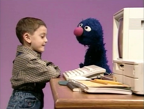 Muppets | Muppet & Kid Moment β Grover watches Matthew type a number 4 on a computer. |