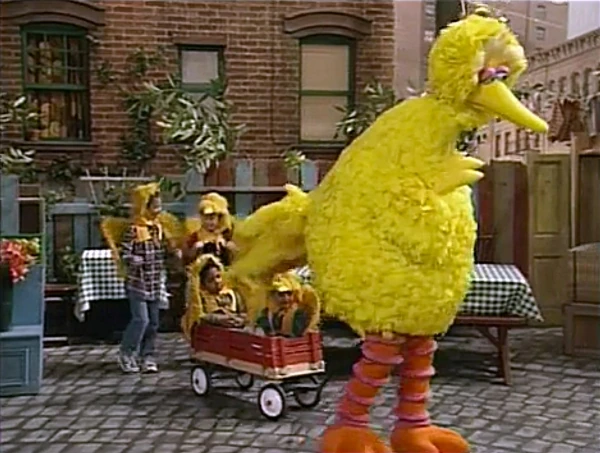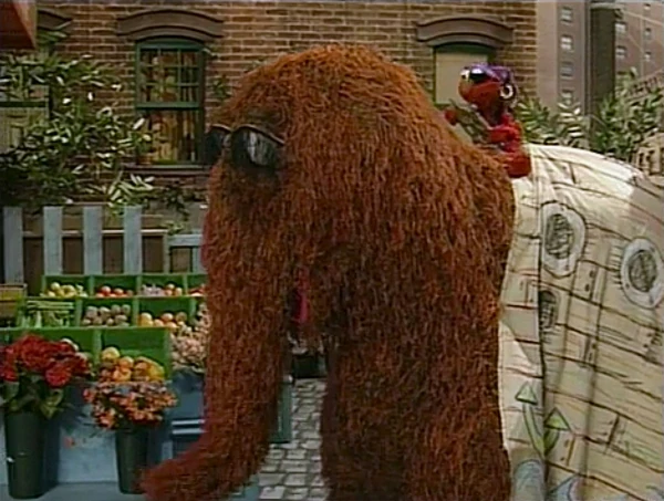 SCENE 2 | Maria notices Elmo and Snuffy in deep thought, and Elmo suddenly gets the idea to have Maria build them a ship. Maria doesn't have time or materials to build one, so she suggests that they use something else and pretend it's a ship. Maria leaves, and the two encounter Big Bird giving wagon rides to the Birdketeers, which means they can't borrow his wagon right now. They realize that it's not easy to find a device that can fit both of them since Snuffy's almost as big as a pirate ship, which gives Elmo an idea... |