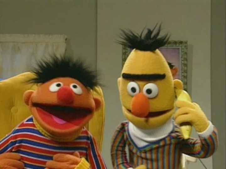 Muppets | Ernie and Bert: Banana Talk β Ernie pretends to talk on the phone with an elephant, who then asks to speak with Bert. (First: Episode 3899) |
