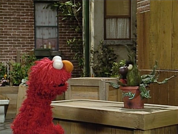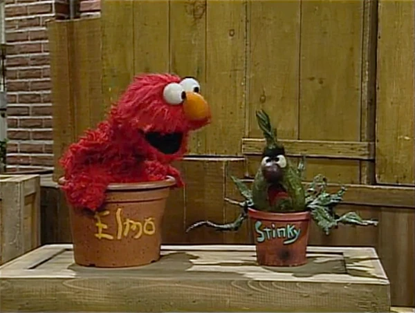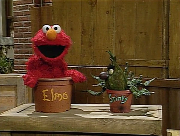 SCENE 1 | Stinky welcomes the viewer and wishes to tell them what they'll be seeing today, but has no clue what it will be; on cue, Elmo arrives and announces the sponsors. He then asks Stinky if it's fun being a plant, and decides he wants to pretend to be a plant today. Stinky suggests that he get his own flower pot and Elmo runs off to get one, and Stinky feels honored that Elmo wants to be like him. |