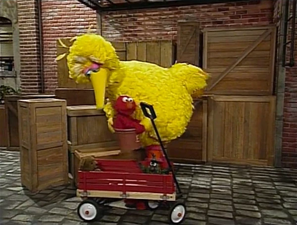 SCENE 6 | Big Bird takes Radar for a ride on the "Teddy Bear Bus" (a wagon). Elsewhere, Elmo wonders if plants can move around, and Stinky says they can't... unless, perhaps, they're on a wagon such as Big Bird's! Big Bird agrees to take Elmo and Stinky for a ride, so he loads them up into his wagon and they all head off. |
