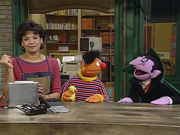 SCENE 1 | Maria and Ernie (with Rubber Duckie) watch as the Count finishes packing for a trip to a counting convention. He asks Maria if she can count things on Sesame Street while he is away, but she claims she's too busy working at the Fix-It Shop. Ernie volunteers to be the "Count for a Day" and demonstrates by counting Maria. The Count is delighted and decides to give him a fast lesson about counting before he leaves. |