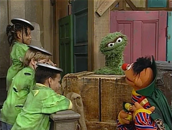 SCENE 5 | Ernie interrupts a meeting between Oscar and the Grouchketeers, counting the members' trash can lid hats and face smudges. He then counts the ways Oscar tells him to get lost, causing the Grouch to let out a groan in misery. (Ernie: "You know, Bert says that a lot, too.") |