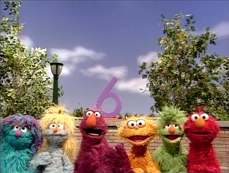 SCENE 3 | The number 6 is displayed on a brick wall in a park. Telly, Elmo, Lulu, Zoe, and two other monsters (Alice Dinnean and Joey Mazzarino) are supposed to show 6 of something, but they don't have anything with them... until they realize that they have each other to count! |