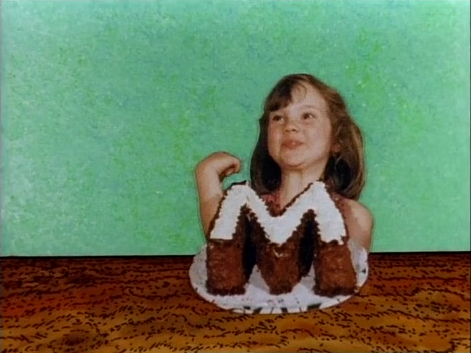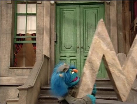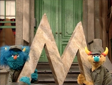 SCENE 5 | Two monster movers (Stephanie D'Abruzzo and Kevin Clash) carry a large marble letter M past the camera, and show it to the viewer. |