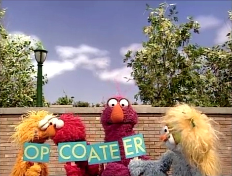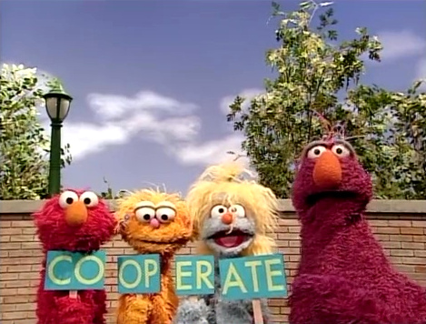 SCENE 6 | Back at the park, Lulu, Telly, Elmo, and Zoe have signs with either small words or parts of words, which Telly thinks should be combined into one word. After a couple of tries they team up to form the word "COOPERATE." |