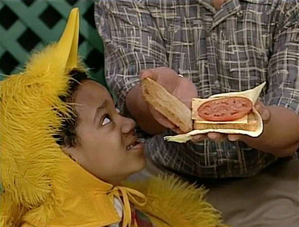 SCENE 6 | Big Bird and the Birdketeers are about to start another game when Alan brings them some sandwiches. Big Bird decides to turn it into a game called "Name That Food!" Of course, the sandwiches are pretty easy to guess when the kids get to see what's inside them. Alan serves them cheese-and-tomato sandwiches, though Big Bird is hesitant to try one at first but finds he likes it. He also looks forward to the next round: desserts! |