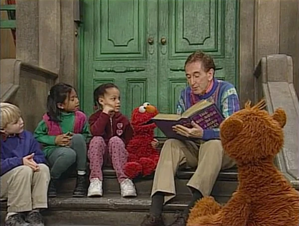 SCENE 7 | Bob continues reading the story, which is acted out flawlessly, though Baby Bear is more optimistic than usual - he's overjoyed that his bowl is empty and his chair is broken. When the Bears confront Goldilocks, she jumps up and runs away... only to find that she isn't being chased away like usual. Instead, the Bears are grateful she's there and give her a big hug. Elmo and the kids leave when the story is over, but Big Bad approaches Bob and begs to hear the story again since the Three Pigs aren't back yet (and he's too busy being in stories rather than reading them). |