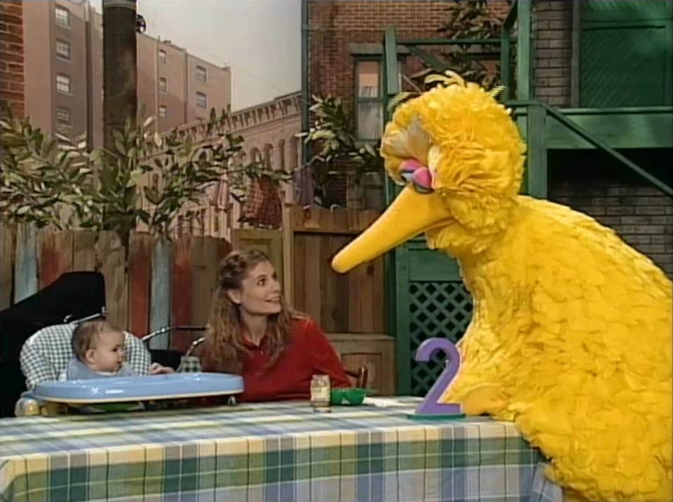 SCENE 2 | Gina feeds Hannah some lunch in the yard when Big Bird returns to teach Hannah all about the number 2. They count the various pairs of body parts she has; Big Bird believes she is learning already and runs off to find something else to impart on her. |