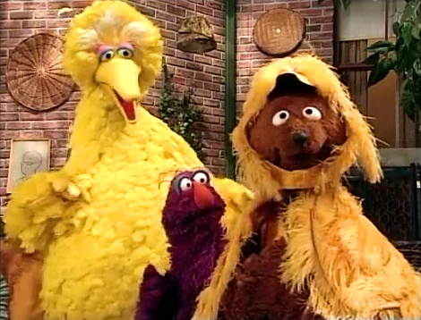SCENE 3 | The whistling expert turns out to be Big Bird, who is quite adept in whistling various bird calls and has already taught the Birdketeers to whistle. He believes that in order to whistle like a bird, Baby Bear needs to think like a bird. The kids dress him up in a Birdketeer outfit and Big Bird instructs him on how to feel more bird-like. With an avian frame of mind, Baby Bear attempts a whistle but still fails. He does, however, feel a hankering for birdseed. |