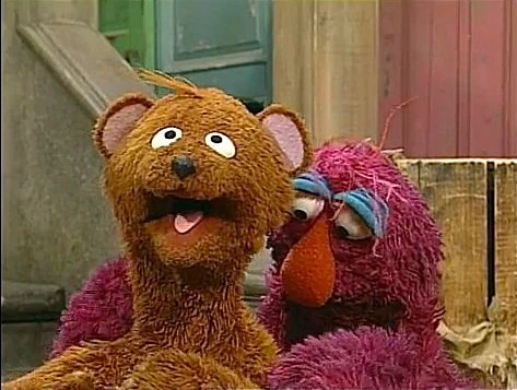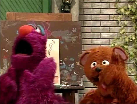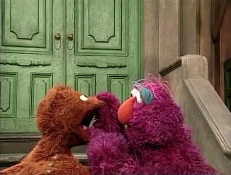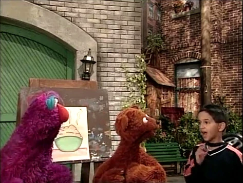 SCENE 2 | The pair dance down the block continuing their exercise when Telly reveals his secret to whistling: "You just put your lips together... and blow." Baby Bear struggles to pucker his lips correctly, even when Telly tries to do it manually (Telly: "You know, your snout is really flexible!"). Telly attributes Baby Bear's problem to being too tense and relaxes his pal, having him imagine he's at the beach. With a calmer demeanor, Baby Bear gives it a try and ends up spitting in Telly's face ("I think I got a little bit of the ocean mist there."). Telly resolves to take Baby Bear to see a whistling expert. |