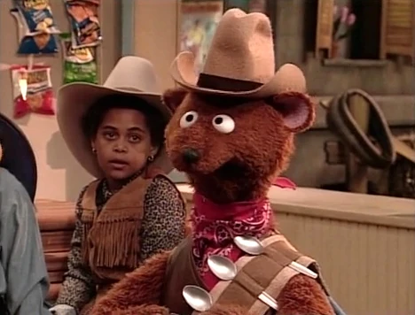 SCENE 3 cont'd | Hooper's becomes a wild West saloon, with Miss Kitty supplying the music still. When Cowboy Elmo moseys in and orders a bowl of porridge, Cowboy Alan tells him that the town only has one bowl of porridge... and it belongs to the Porridge Kid, the fastest spoon in the West! The Porridge Kid (portrayed by Baby Bear, wearing a cartridge belt full of spoons) arrives to keep this "stwanger" from muscling in on his claim, but Cowboy Elmo proposes the two share the porridge and be friends. The Porridge Kid agrees and everyone is happy. |