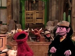 SCENE 4 cont'd | In the wild West, Cowboy Elmo meets Cowboy Count - "They call me Cowboy Count because I love to count cows!" However, there appears to be no cows for him to count. Accompanied by Miss Kitty, Cowboy Elmo launches into "The Cow Song," which attracts four mooing cows to be counted (along with a mooing cactus, tumbleweed, and Porridge Kid). |