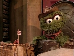 SCENE 5 cont'd | Cowboy Oscar and Cowboy Slimey wait for the stagecoach to take Slimey to Worm City. However, a child informs them that the stagecoach won't be running until tomorrow - it's the horse's day off. Cowboy Elmo comes to the rescue by pretending to be a horse and carries Cowboy Slimey to town. |