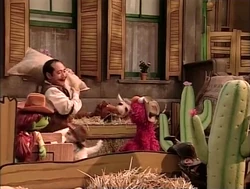 SCENE 1 cont'd | In Elmo's imagination, all of Sesame Street has become an old West town. Cowboy Elmo greets some of the locals, including Cowgirl Elizabeth, Cowboy Alan, Cowboy Bird, and Miss Kitty (playing the piano). He even greets a local cow and cactus as cowgirls and cowboys. |