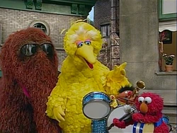 SCENE 2 | Ernie plays part of "Dance Myself to Sleep" while Elmo watches. He decides to be his own band too, and leaves to go get his bass drum and violin (with the bow doubling as the drumstick). While Ernie continues playing his song, Elmo performs "Elmo's Song" next to him. Susan and Gordon, not too thrilled that the music has become louder, decide it's a good time to take a walk. (YouTube) |