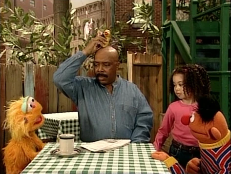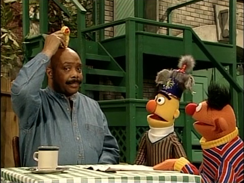 SCENE 6 | Rubber Duckie is still napping when Bert arrives, wearing his Pigeon Lovers' fez and telling Ernie he's missed the entire convention. Since they already have a duckie sitter in Gordon, they decide to go see a movie (The Adventures of Oatmeal) while Gordon remains behind, holding Rubber Duckie on his head. |