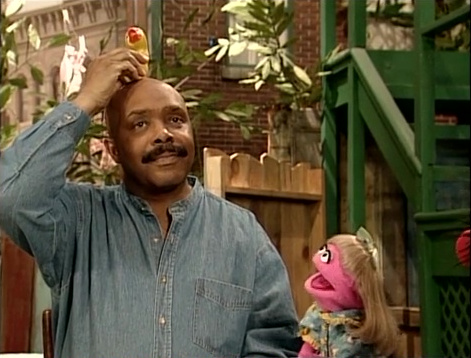 SCENE 2 | After Gordon gets tired of squeaking, Ernie now shows him how Rubber Duckie likes to be held - on top of his head. Gordon says he'd feel ridiculous doing so, but Ernie guilts him into doing it by having Rubber Duckie feel sad about Gordon breaking his promise. Prairie Dawn observes the duckie on Gordon's head, then quickly splits when Ernie proposes she help duckie-sit as well. Gordon thinks he has everything he needs until Ernie rushes back to the apartment to get his list of Rubber Duckie care requirements. "How do I get myself into these things?" Gordon sighs. |
