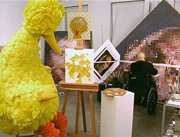 Muppets / Celebrity | Big Bird visits the studio of Chuck Close, who shows how he prepares to paint his self portrait. |