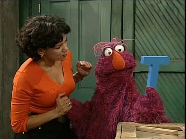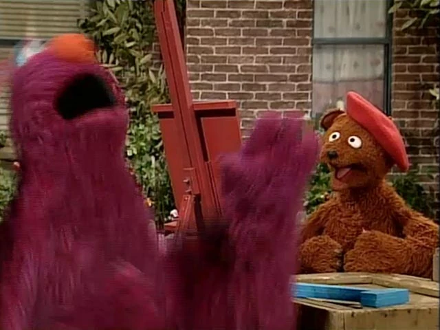 SCENE 1 | Telly presents his favorite letter, T, and lists a few T words. Baby Bear spots him and ropes him into modeling for his drawing session, needing something special to draw. He instructs Telly how to pose with the T, switching his mind back and forth several times until he settles on just the right pose. He then realizes he doesn't have a fuchsia crayon and runs home to get it, instructing Telly to hold his pose. |