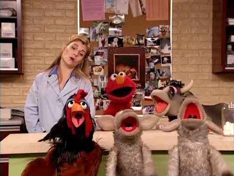 SCENE 2 cont'd | Elmo now goes to Gina's vet clinic to get her to be their teacher, but she's busy with a waiting room full of animals. Instead, she teaches Elmo about another Y word, "yodel," by singing a "Yodel Song." The song attracts many of the animals from the waiting room. |