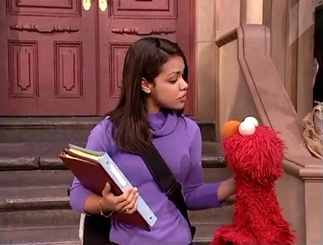 SCENE 2 cont'd | Elmo runs into Gabi as she comes out from 123 Sesame Street and asks her to be their school teacher. Gabi, however, is on the way to her own school. She does have time to teach Elmo how to make the shape of the letter Y by drawing it in her binder. Elmo returns to the nest and shows the same to Big Bird and Snuffy, who write their own letter Ys in the air and ask where Elmo's teacher is. He dashes off again, meaning more recess for the others. |