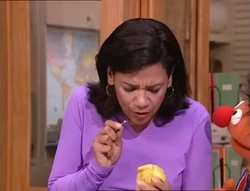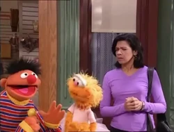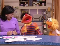 SCENE 2 cont'd | Ernie is devastated when Maria comes by, saying that there must be a way to fix Rubber Duckie. Zoe and Ernie try singing a bit of "Rubber Duckie," but cut it short when they see it doesn't work. They then try counting to twenty since Rubber Duckie loves counting, but that doesn't work either. Zoe decides that they should ask a grown-up, and Maria assumes they mean her and starts to feel flattered until Zoe recommends the Amazing Mumford. |